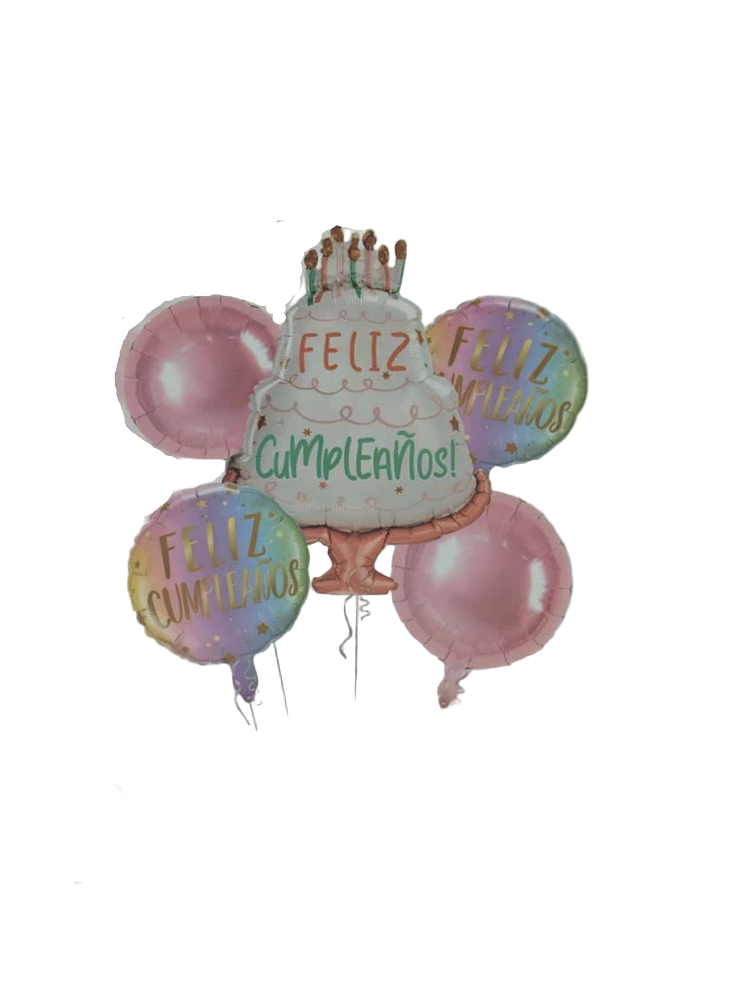 Celebrate birthdays in style with this vibrant 5-piece balloon set. It features a large cake-shaped balloon adorned with "Feliz Cumpleaños" lettering, two bright pink round balloons, and two additional round balloons also inscribed with "Feliz Cumpleaños." Perfect for creating a festive atmosphere, this set combines eye-catching colors and celebratory messages to enhance any birthday party decor effortlessly.