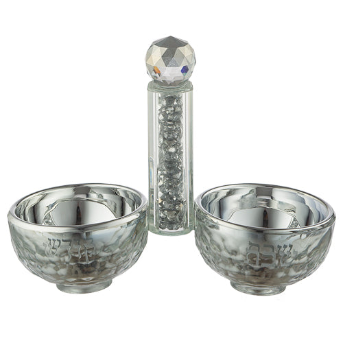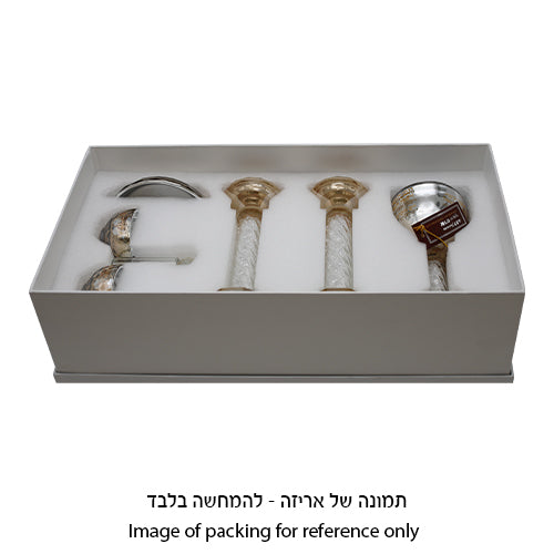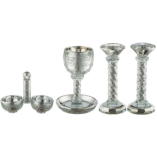 Elevate your table setting with this expert-crafted crystal ensemble featuring elegantly designed candlesticks, a traditional Kiddush cup, and a matching salt and pepper stand adorned with genuine stones. Each piece balances timeless beauty with functional excellence, enhancing ceremonial and everyday dining experiences through refined craftsmanship and sophisticated detail. Ideal for formal occasions or special celebrations where quality and aesthetic harmony matter.