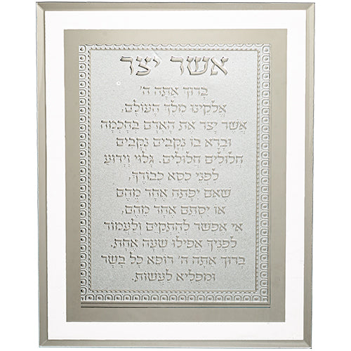 This framed blessing, measuring 17 by 22 centimeters, features the traditional Asher Yazar prayer in the Ashkenaz style. Carefully crafted to reflect authentic religious calligraphy, it serves both as a meaningful spiritual reminder and an elegant decorative piece. Its compact size makes it suitable for various spaces, from home to office, allowing you to keep this important blessing close in daily life.