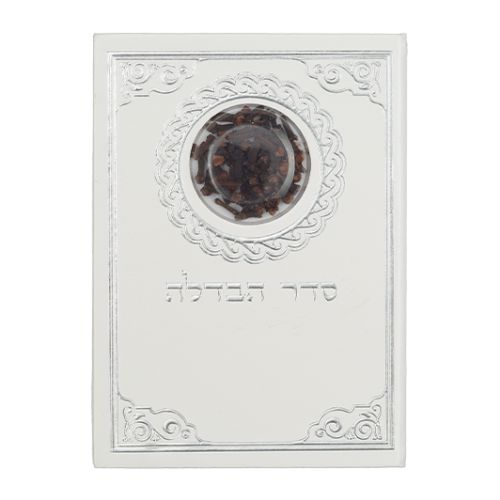 This elegant White PU Havdalah blessing holder, measuring 18.5 by 13 cm, is designed to protect and honor the sacred text for your Havdalah ceremony. Crafted with durable polyurethane, it offers a refined look and lasting quality. Included basil besamim enhances the ritual experience with its traditional fragrance, symbolizing a fragrant conclusion to Shabbat. Perfectly sized for ease of use and storage, this blessing holder combines practicality with spiritual significance for a meaningful observance.
